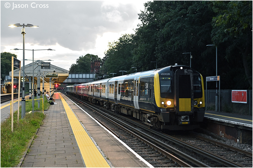 450028 and 450044 arrive at Banres with the 2S66 2003 Weybridge to London Waterloo service. Date: 27 July 2023 Manipulation Notes: None
