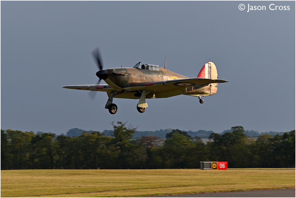 Coming in to land after the 'Duxford Big Wing' flypast; Hurricane MkI R4118. Imperial War Museum Duxford, Battle of Britain Airshow 2023. Date: 16 September 2023 Manipulation Notes: None