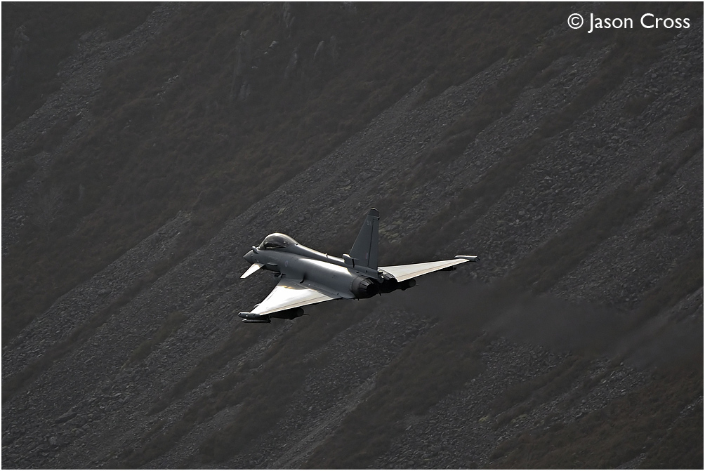 Royal Air Force Typhoon FGR4 ZK311 of 12 Squadron from RAF Coningsby flies through the Cader Idris pass in the Mach Loop. Date: 25 September 2023 Manipulation Notes: None