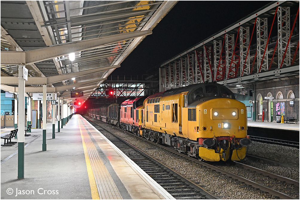 97303 and 37405 arrive on the middle road at Chester with the 6C55 1549 Aberystwyth Kronospan to Chirk Kronospan log train. Date: 29 September 2023 Manipulation Notes: None