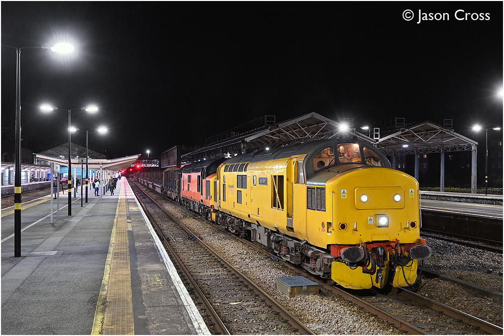 97303 and 37405 stand on the middle road at Chester with the 6C55 1549 Aberystwyth Kronospan to Chirk Kronospan log train prior to the locos running round the train. Date: 29 September 2023 Manipulation Notes: None