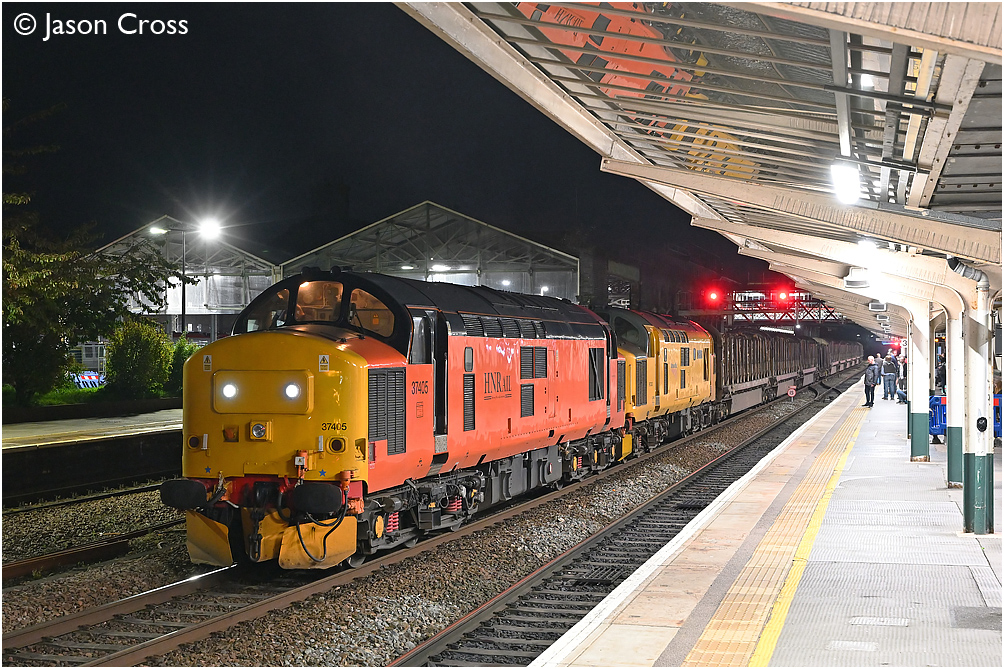37405 and 97303 wait to depart from Chester with the 6C55 1549 Aberystwyth Kronospan to Chirk Kronospan log train. Date: 29 September 2023 Manipulation Notes: None