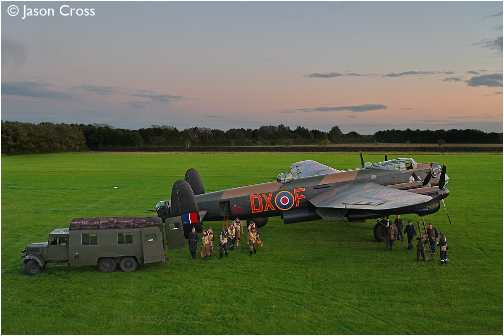 Sunset at East Kirkby and Avro Lancaster B MkVII NX611 'Just Jane' prepares to go out on a sortie. Timeline Events photo shoot. Date: 14 October 2023 Manipulation Notes: None Camera mounted on a tall pole and remotely fired