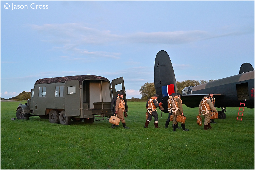 Sunset at East Kirkby and the crew arrive to take Avro Lancaster B MkVII NX611 'Just Jane' out on a sortie. Timeline Events photo shoot. Date: 14 October 2023 Manipulation Notes: None