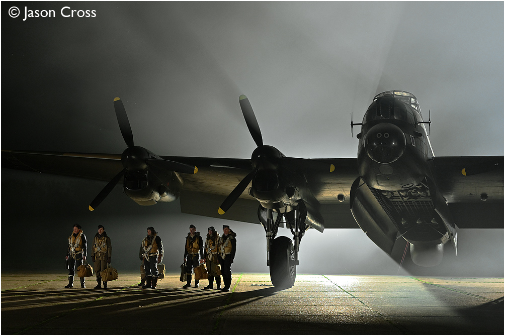 As the mist rolls across the airfield, the crew of Avro Lancaster B MkVII NX611 'Just Jane' walk away from their aircraft following their