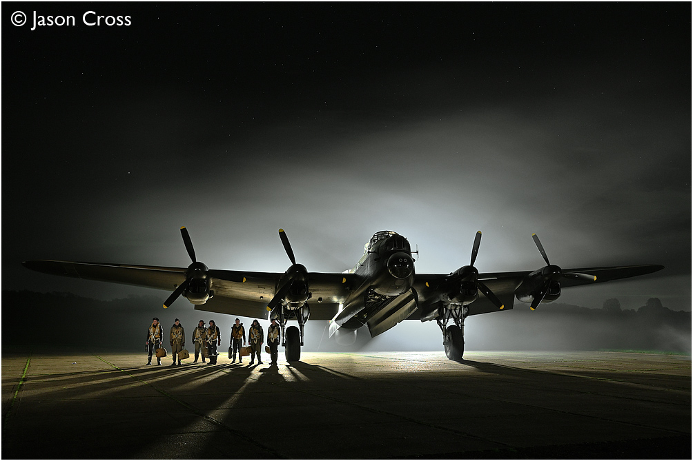 As the mist rolls across the airfield, the crew of Avro Lancaster B MkVII NX611 'Just Jane' walk away from their aircraft following their