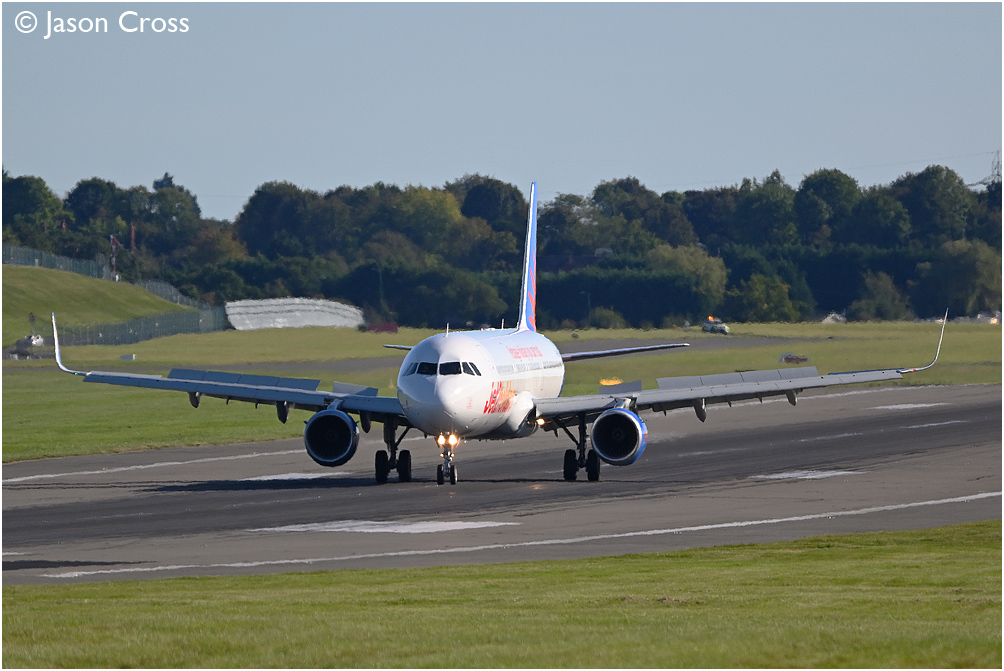 Jet2 Airbus A321 G-HLYA landing at Birmingham Airport with flight LS1204 from Malaga. Date: 15 October 2023 Manipulation Notes: None