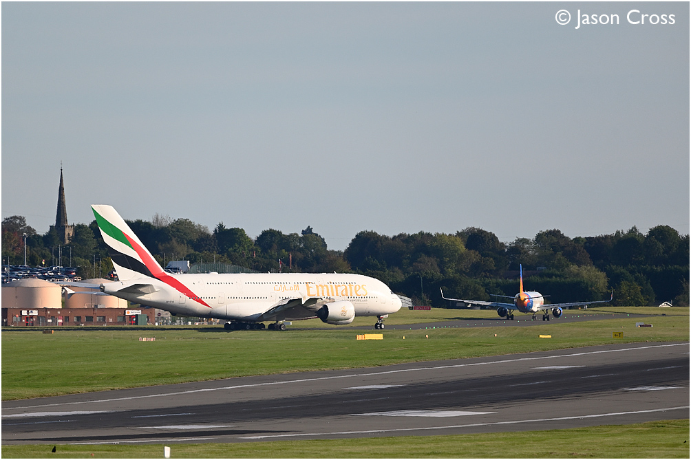 Emirates Airbus A380 A6-EVA follows Jet2 Airbus A321 G-HLYF on the taxiways at Birmingham Airport. The A380 was flight UAE40 to Dubai and the A321 was flight LS1259 to Gran Canaria. Date: 15 October 2023 Manipulation Notes: None