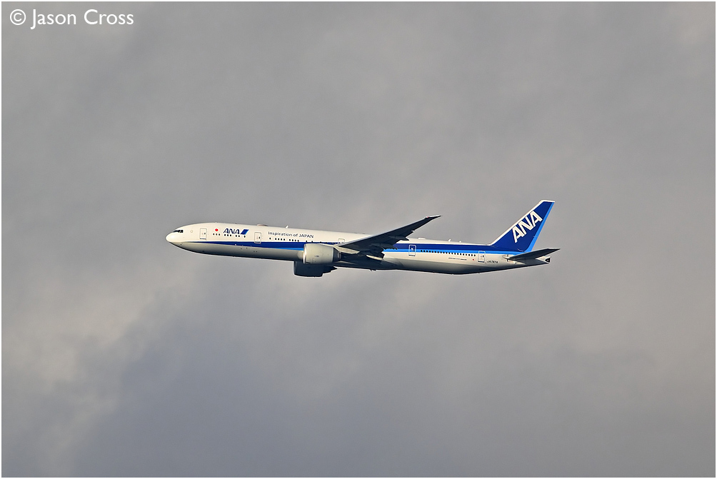 All Nippon Airways Boeing 777 JA797A lines up to land on Heathrow's runway 27R with flight ANA211 from Tokyo. The photo was taken from Wimbledon Common. Date: 20 October 2023 Manipulation Notes: None