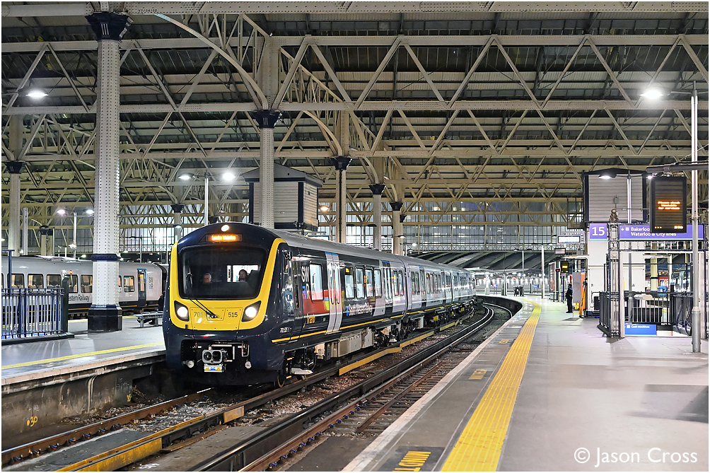 701515 and 701516 arrive into London Waterloo's platform 14 with a 5Q42 Southampton Down Loop to London Waterloo test run. Date: 20 October 2023 Manipulation Notes: None