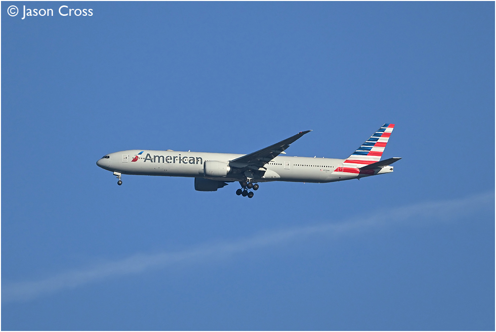 American Airlines Boeing 777 N720AN lines up on Heathrow's runway 27L with flight AAL56 from Miami. Photo taken from Wimbledon Common. Date: 22 October 2023 Manipulation Notes: None