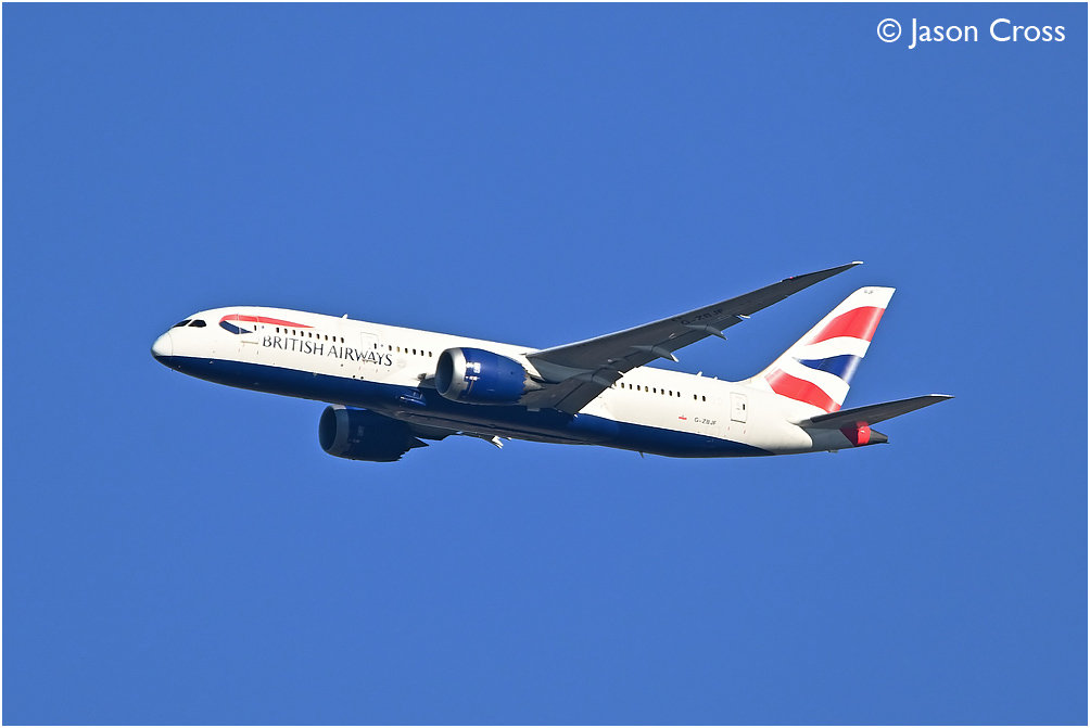 British Airways Boeing 787 G-ZBJF lines up with Heathrow's runway 27L with flight BA224 from New Orleans. Photo taken from Wimbledon Common. Date: 22 October 2023 Manipulation Notes: None