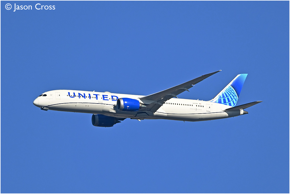 United Airlines Boeing 787 N25982 begins to lower its gear as it lines up with Heathrow's runway 27L with flight UAL262 from Denver. Photo taken from Wimbledon Common. Date: 22 October 2023 Manipulation Notes: None