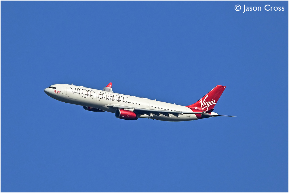 Virgin Atlantic Airbus A330 G-VINE banks left to line up with Heathrow's runway 27L with flight VIR118 from Miami. Photo taken from Wimbledon Common. Date: 22 October 2023 Manipulation Notes: None