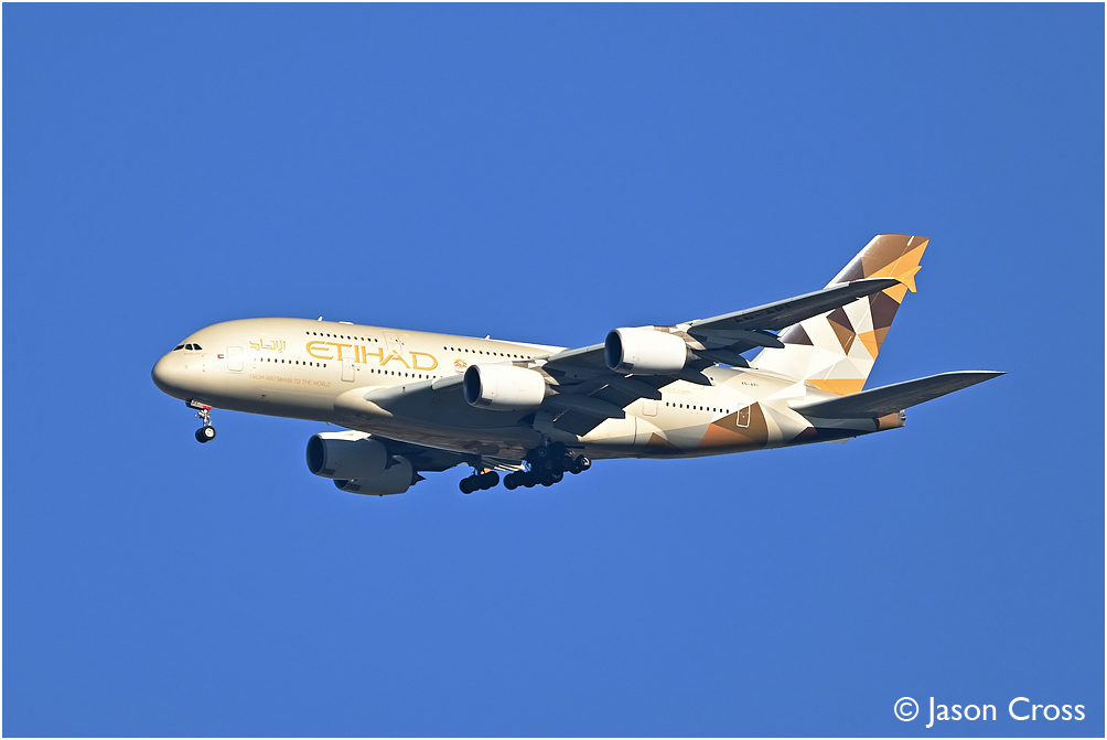 Etihad Airbus A380 A6-EPI lines up with Heathrow's runway 27L with flight ETD75F from Abu Dhabi. Photo taken from Wimbledon Common. Date: 22 October 2023 Manipulation Notes: None