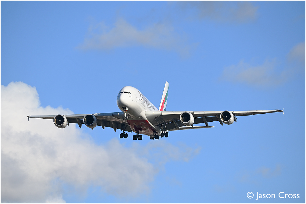 Emirates Airbus A380 A6-EUC approaches Heathrow's runway 27R with flight UAE4PY from Dubai. Date: 22 October 2023 Manipulation Notes: None