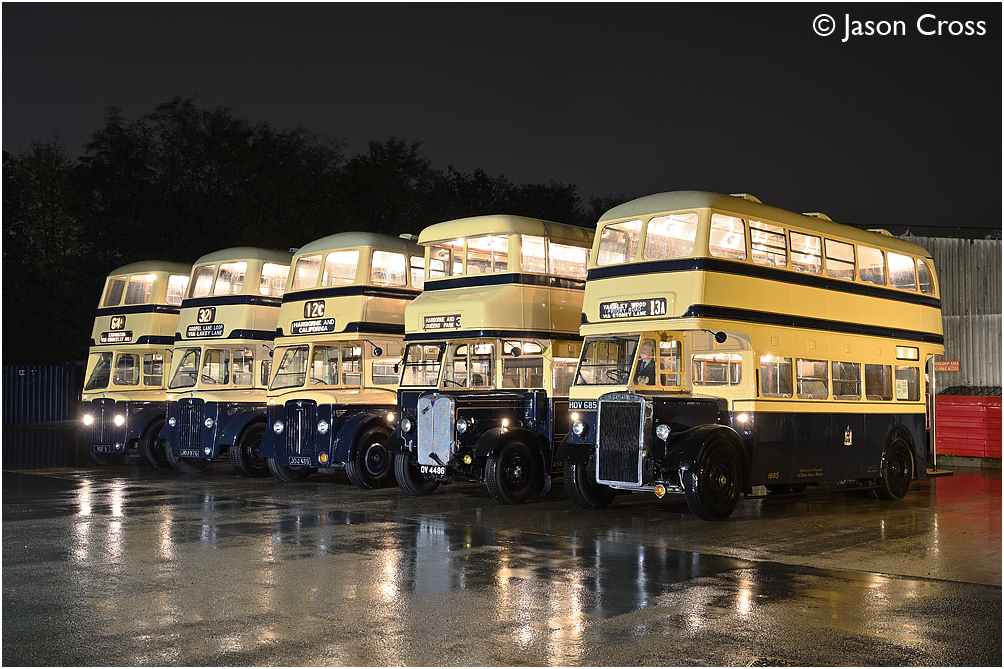 Birmingham City Transport buses; 1685 ( Leyland PD2), 486 ( AEC Regent), 2489 ( Crossley), 2976 ( Guy Arab IV) and 3009 ( Guy Arab IV) Wythall Transport Museum. David Williams photo shoot. Date: 28 October 2023 Manipulation Notes: None