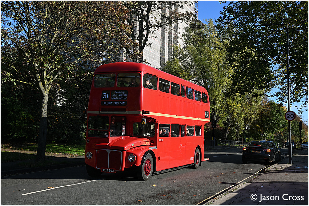 RML903 on Adelaide Road in Primrose Hill with a Camden Town to Kilburn Park 31 route service. Chalk Farm Vintage Bus Running Day (in aid of the Royal British Legion's Poppy Appeal). Date: 5 November 2023 Manipulation Notes: None
