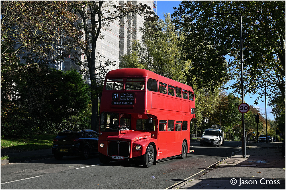 RM848 on Adelaide Road in Primrose Hill with a Camden Town to Kilburn Park 31 route service. Chalk Farm Vintage Bus Running Day (in aid of the Royal British Legion's Poppy Appeal). Date: 5 November 2023 Manipulation Notes: None