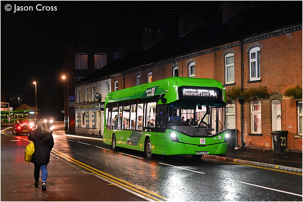 First Leicester 63565 on Woodgate with a 14A Leicester City Centre to Beaumont Centre service. Date: 7 November 2023 Manipulation Notes: None