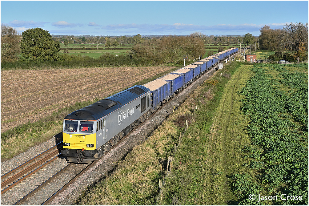60055 passes Rearsby with the 6M89 0901 Middleton Towers to Ravenhead Sidings sand train. Date: 11 November 2023 Manipulation Notes: None Camera mounted on a tall pole and remotely fired