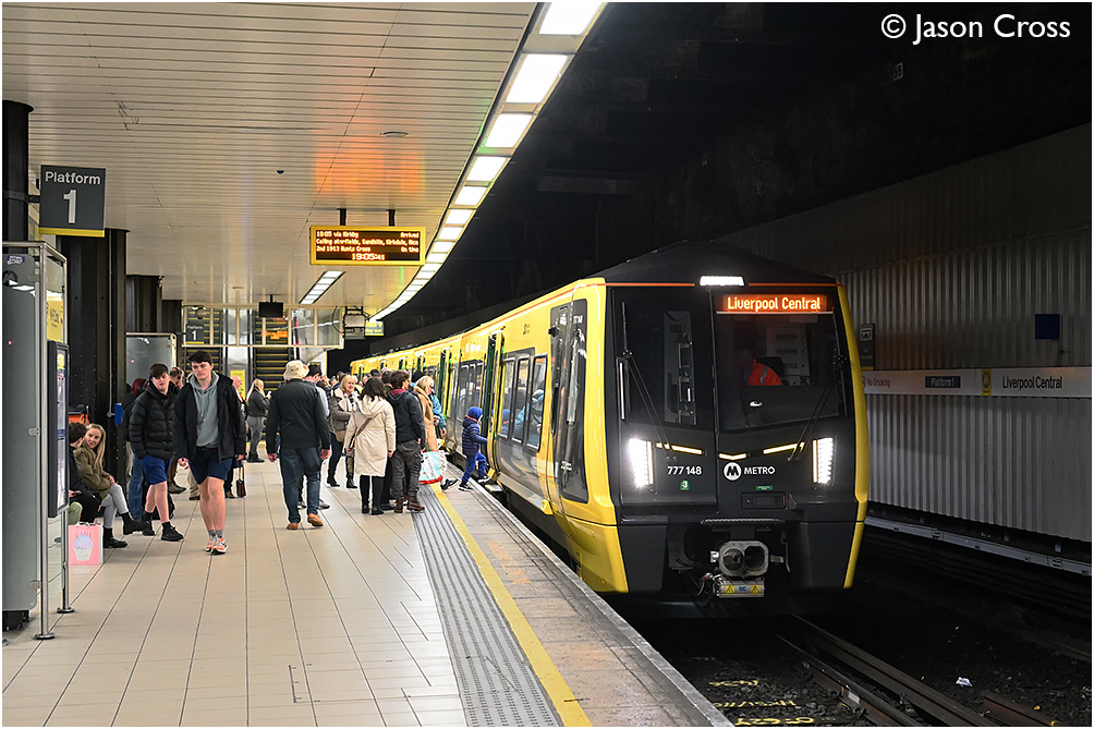 777148 has just arrived at Liverpool Central with the 2F53 1841 from Headbolt Lane and is about to form the 2K51 1905 return. Date: 19 November 2023 Manipulation Notes: None