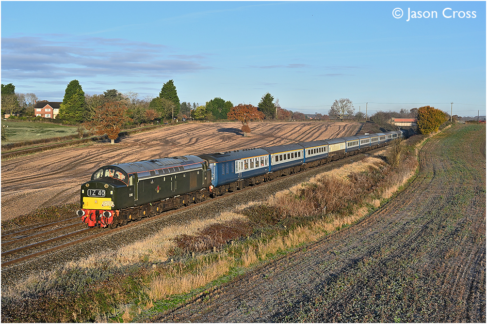 Class 40 D345 powers past Abbotswood with a 1Z40 0707 Burton-on-Trent to Salisbury railtour. Date: 25 November 2023 Manipulation Notes: None Camera mounted on a tall pole and remotely fired