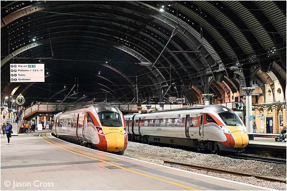 801204 departs York with the 1S26 1855 York to Edinburgh, while on the left is 800107 on the 1E23 1630 Edinburgh to King's Cross. Date: 25 November 2023 Manipulation Notes: None