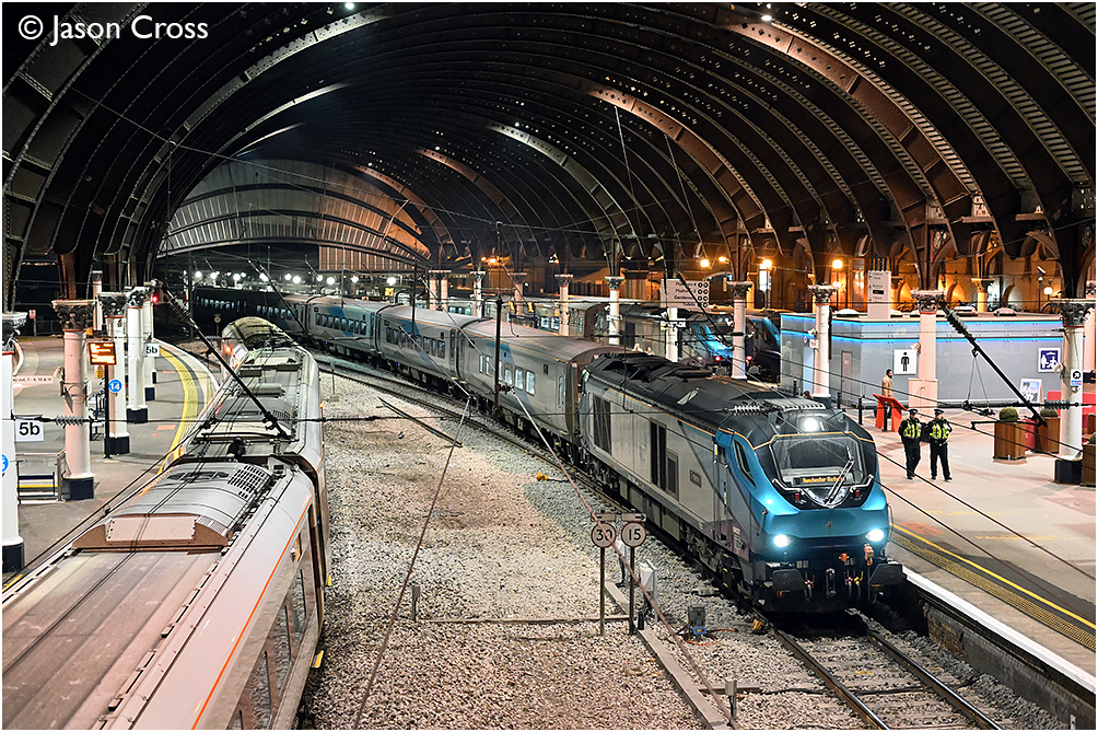 68021 'Tireless' departs from platform 4 at York with the 1K42 2043 Scarborough to Manchester Victoria. Date: 25 November 2023 Manipulation Notes: None