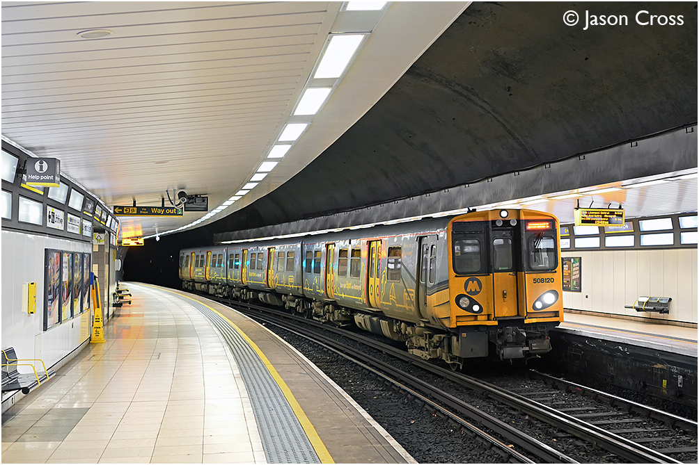 508120 arrives at Hamilton Square with 2N37 1523 New Brighton to New Brighton via Liverpool Central. Date: 10 December 2023 Manipulation Notes: None