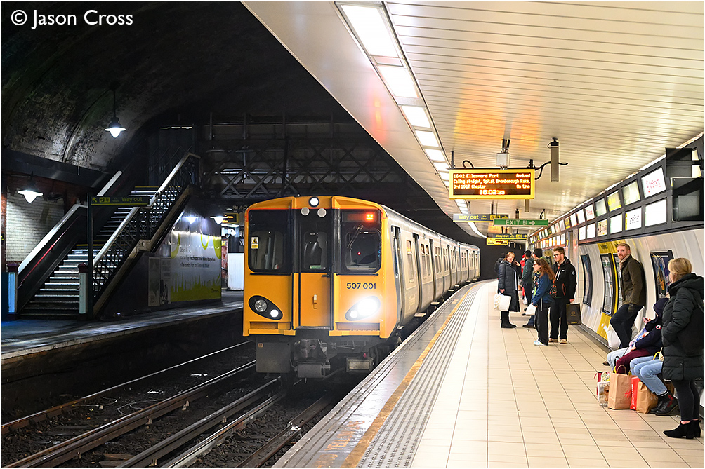 507001 at Liverpool James Street with the 2Y20 1519 Ellesmere Port to Ellesmere Port via Liverpool Central service. Date: 10 December 2023 Manipulation Notes: None