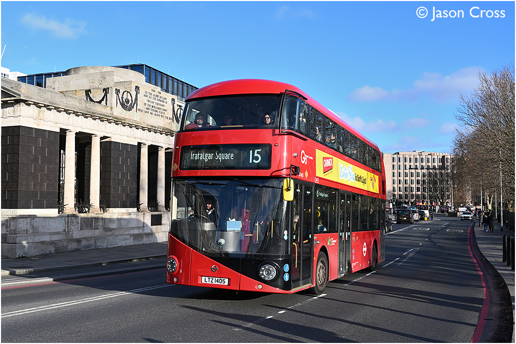 LT398 passes the Tower Hill Memorial with a Blackwall to Trafalgar Square 15 service. Date: 17 December 2023 Manipulation Notes: None