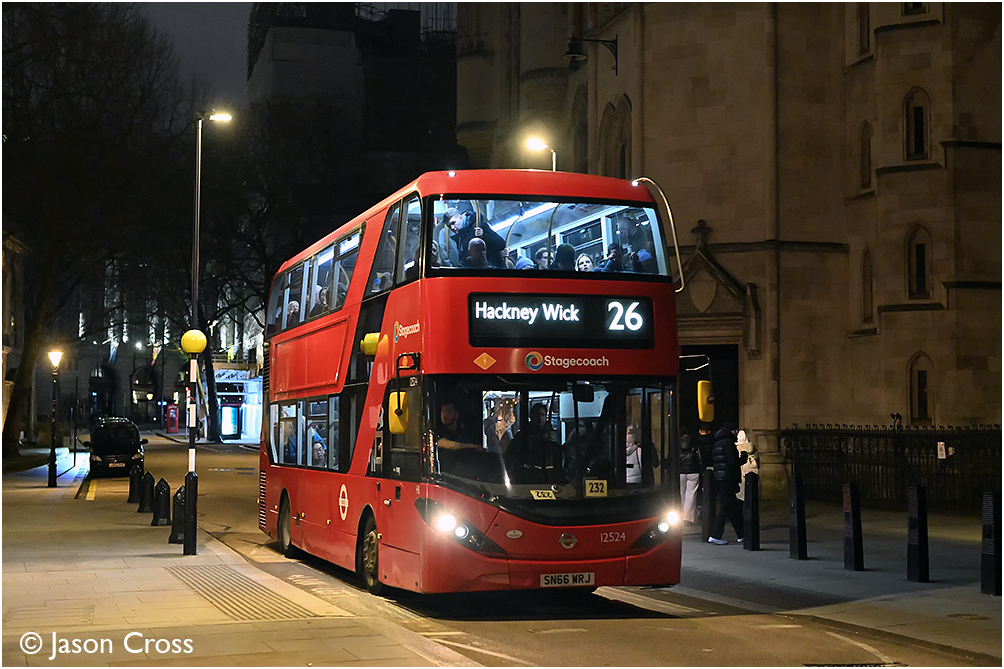12524 passes The Royal Courts of Justice with a 26 service from Victoria to Hackney Wick. Date: 17 December 2023 Manipulation Notes: None