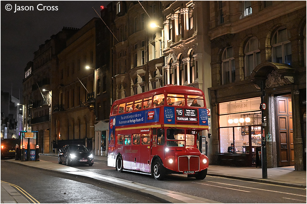 Routemaster RM1941 on Fleet Street in London with a Tower Gateway to Trafalgar Square T15 tourist service. Date: 17 December 2023 Manipulation Notes: None