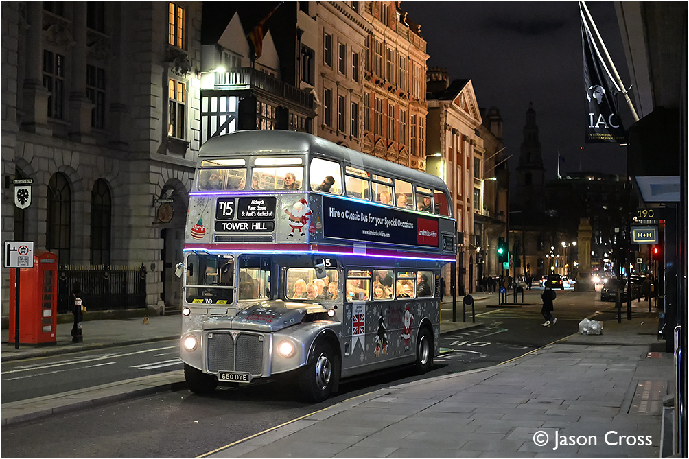 Silver Routemaster SRM3 (RM1650) on Fleet Street in London with a Trafalgar Square to Tower Hill T15 tourist service. Date: 17 December 2023 Manipulation Notes: None