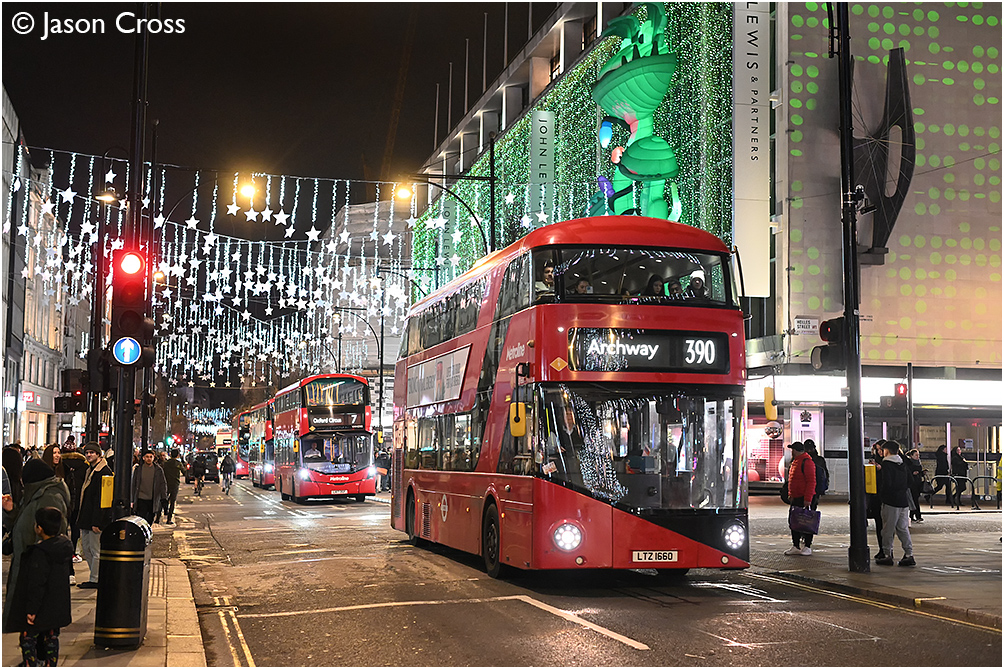LT660 on Oxford Street with a Victoria to Archway 390 service. Date: 17 December 2023 Manipulation Notes: None