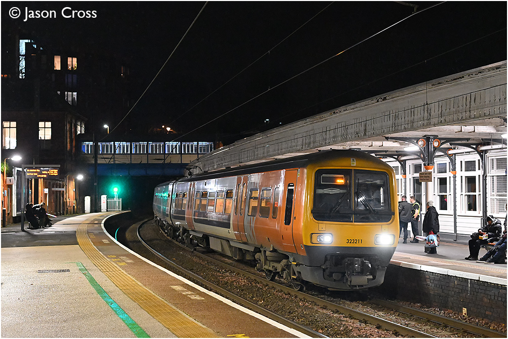323211 arrives at Sutton Coldfield with the 2R49 1716 Four Oaks to Redditch. Date: 20 December 2023 Manipulation Notes: None