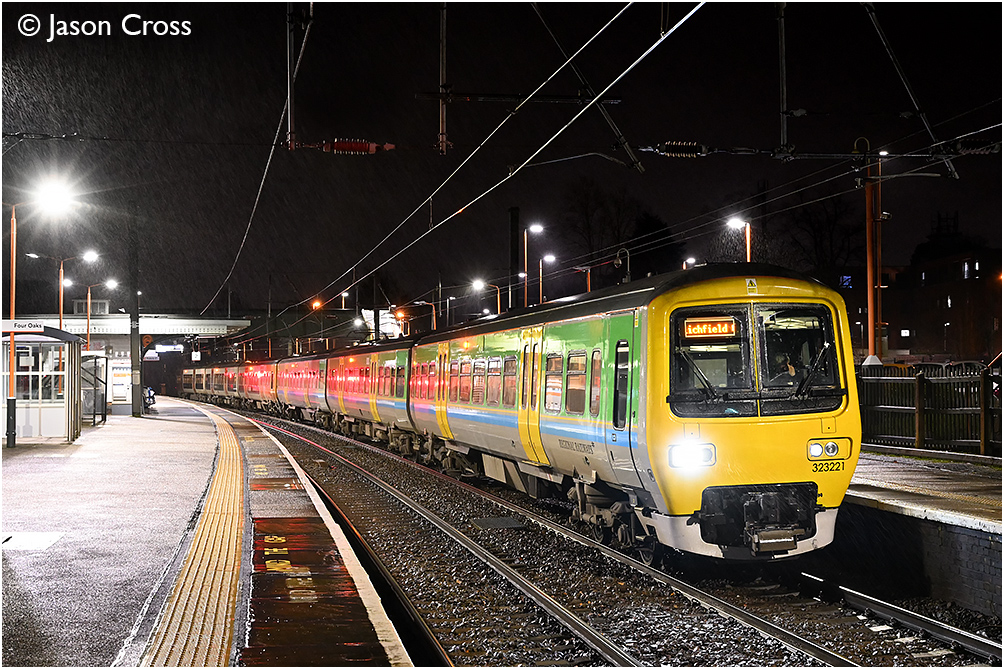 Retro liveried 323221 leads a classmate at Four Oaks with the 2L69 2203 Bromsgrove to Lichfield City service. Date: 20 December 2023 Manipulation Notes: None