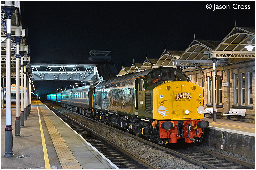 D213 'Andania' slows to stop at Loughborough with a 1Z36 Edinburgh to Leicester 'Statesman' charter train. Date: 21 December 2023 Manipulation Notes: None