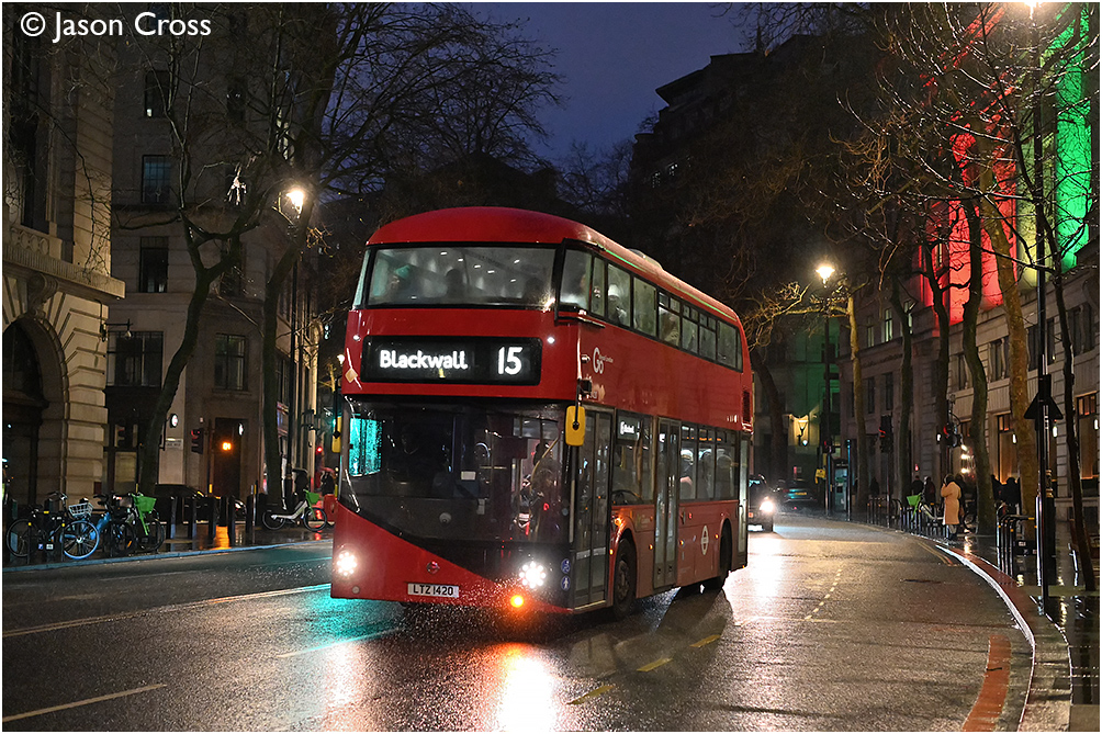 LT420 at the Aldwych with a route 15 Trafalgar Square to Blackwall service. Date: 30 December 2023 Manipulation Notes: None