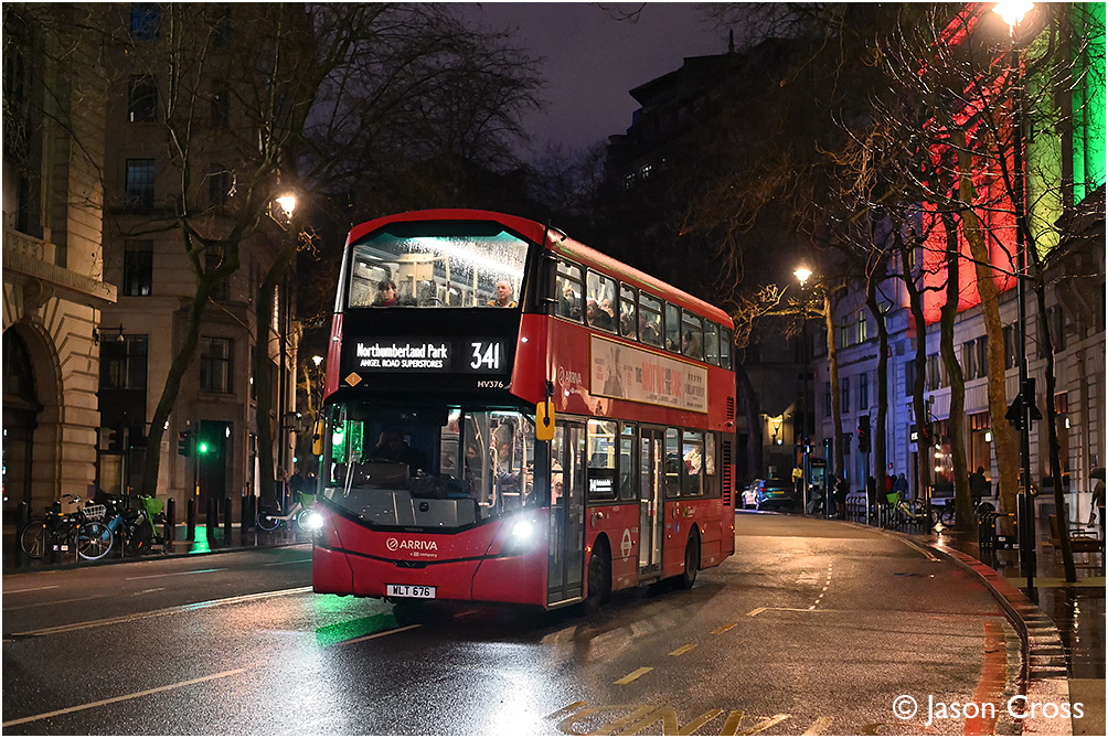 HV376 (with registration formerly carried by Routemaster RM676) at the Aldwych with a 341 Waterloo to Northumberland Park. Date: 30 December 2023 Manipulation Notes: None