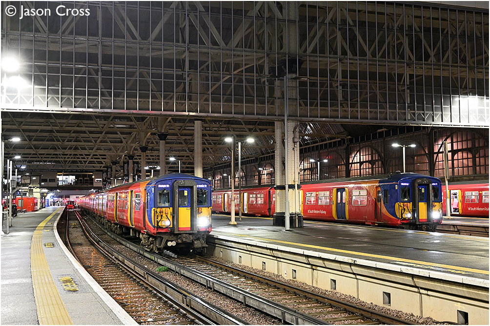 London Waterloo with 5712 and 5719 working the 2M49 1717 London Waterloo to Chessington South and 5730 with 5716 (out of sight) with the 2F49 1720 London Waterloo to Woking. Date: 30 December 2023 Manipulation Notes: None