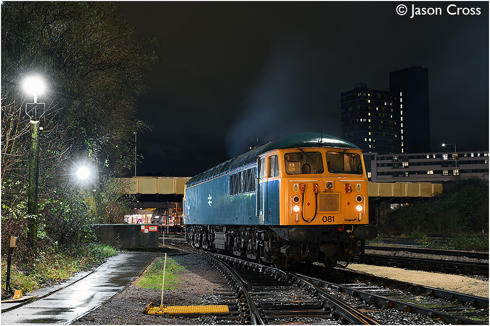 At the end of the photo shoot, 56081 waits to depart Leicester Depot light engine to Asfordby (RIDC Melton). Private photo shoot organised by UKRL, Network Rail and GB Railfreight. Date: 2 January 2024 Manipulation Notes: None