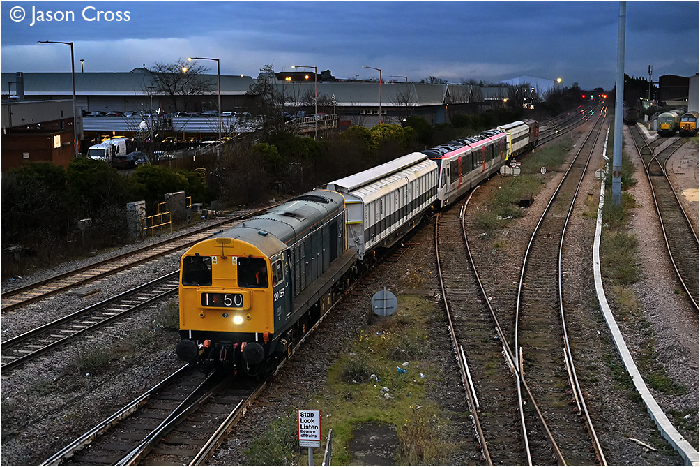 20189 and 20142 sandwich class 398 'tram-train' 398004 on the approach to Leicester working as a 6Q21 1540 Asfordby Test Centre (RIDC Melton) to Pengam Reception Sidings. Date: 5 January 2024 Manipulation Notes: None