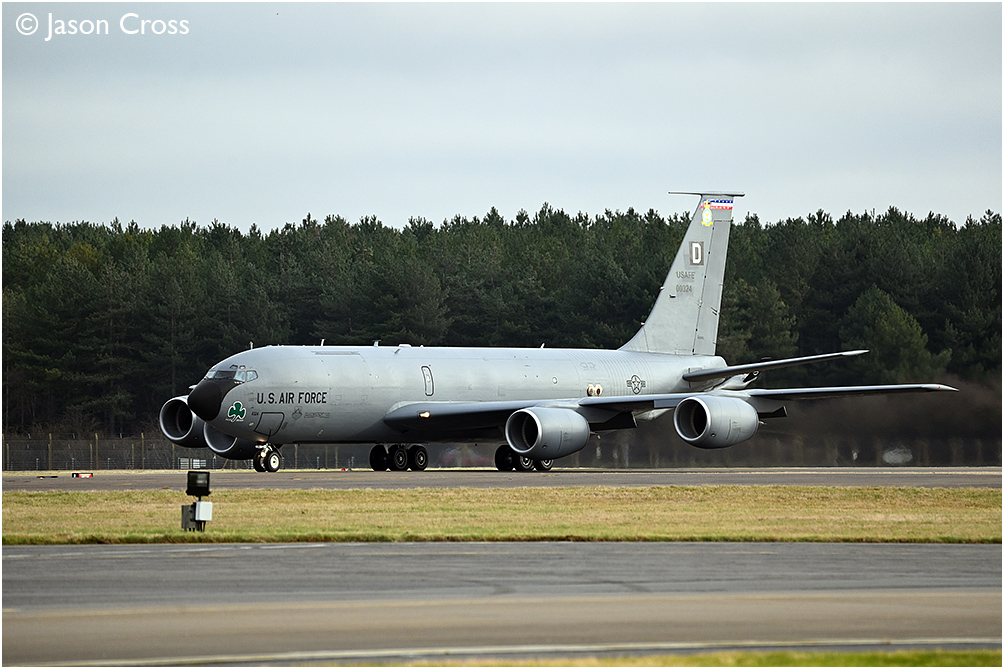USAF Boeing KC135 60-0324 departs from runway 28 at RAF Mildenhall, part of a 5-ship tanker flight (callsign LAGER) to rendezvous with and refuel a flight of B1 bombers over the Atlantic Ocean. Date: 2 February 2024 Manipulation Notes: None