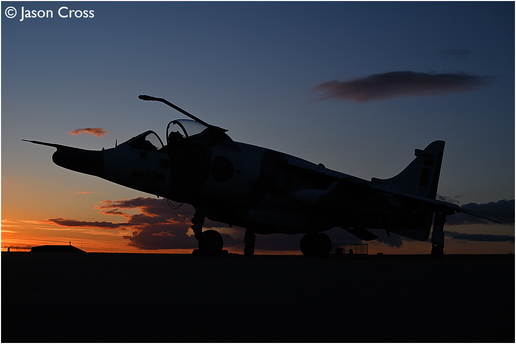 Hawker Siddeley Harrier GR3 XV779 is silhouetted on the apron at RAF Wittering. Centre of Aviation Photography (COAP) / RAF Wittering Heritage Centre photo shoot. Date: 24 February 2024 Manipulation Notes: None