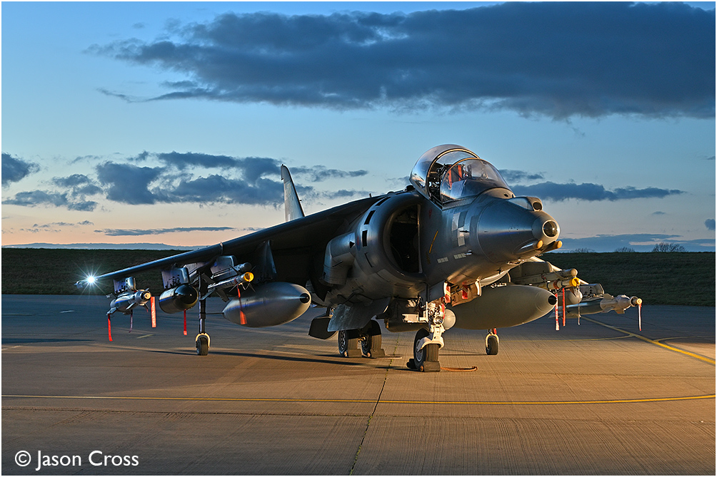 BAe Harrier GR7 ZD318 at RAF Wittering at dusk. Centre of Aviation Photography (COAP) / RAF Wittering Heritage Centre photo shoot. Date: 24 February 2024 Manipulation Notes: None Camera mounted on a tall pole and remotely fired