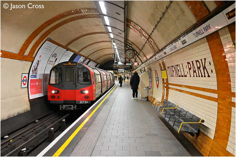 51721 leads a Mill Hill East to Battersea Power Station Northern Line service into Tufnell Park. Date: 13 March 2024 Manipulation Notes: None