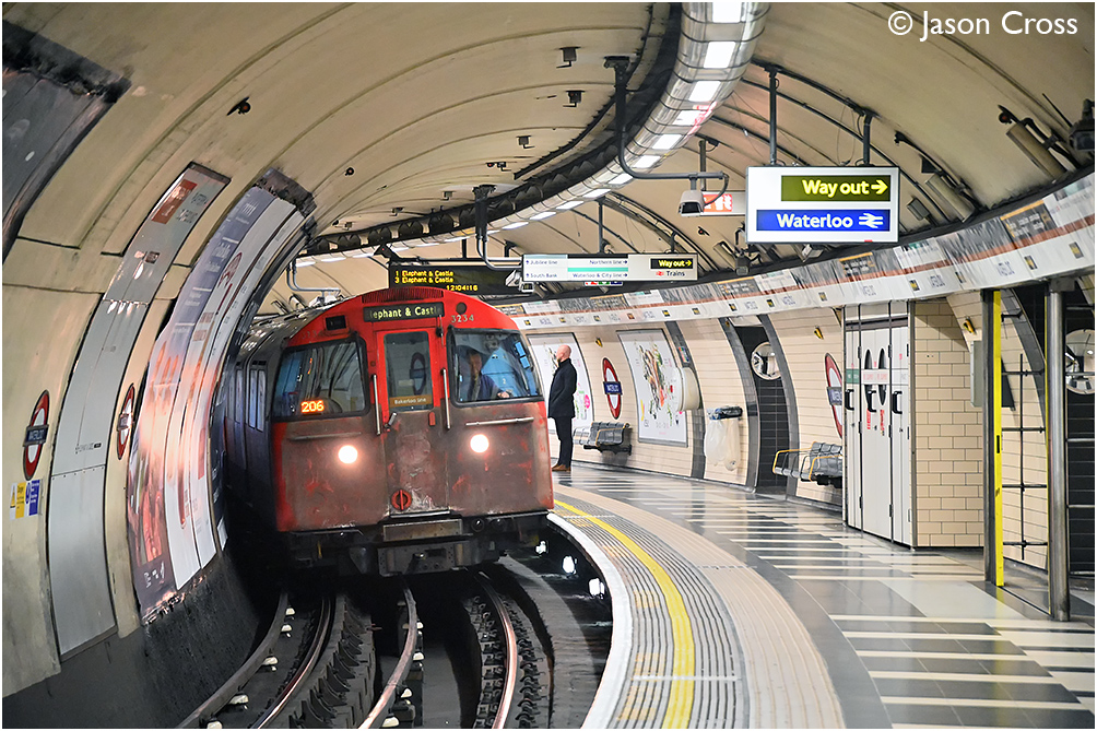 A rather scruffy looking 1972 Tube Stock Driving Motor number 3234 leads a Queen's Park to Elephant & Castle Bakerloo Line service into Waterloo. Date: 13 March 2024 Manipulation Notes: None