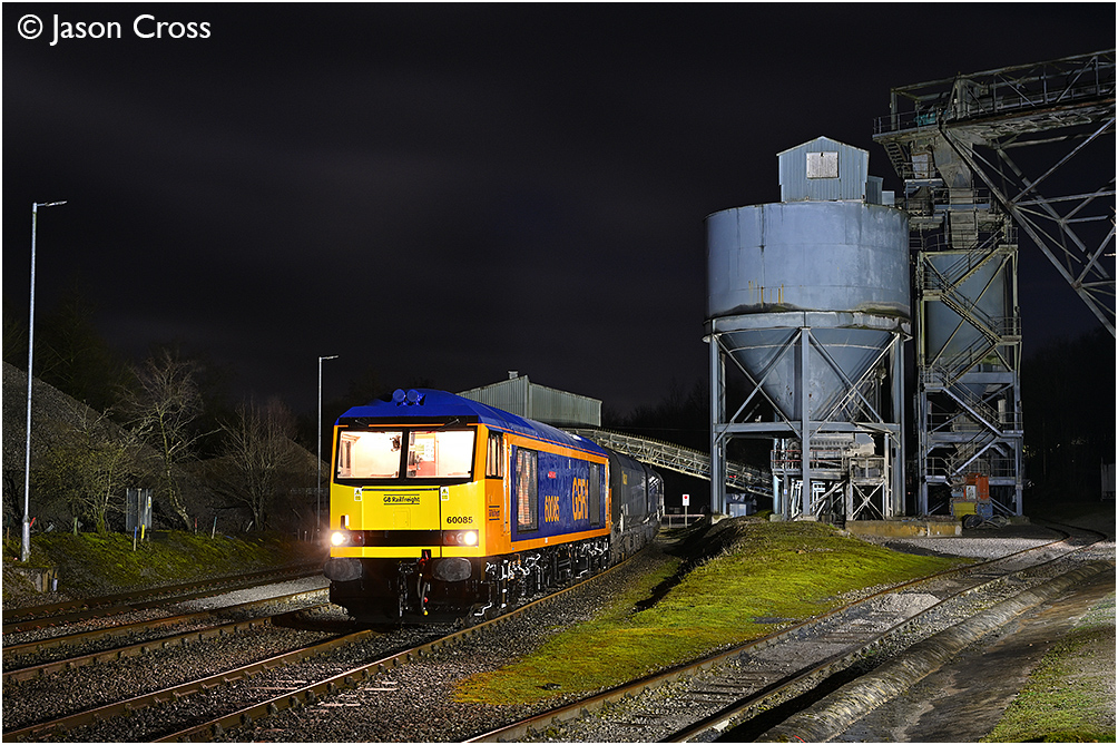 GB Railfreight's 60085 'Snowdon' on a rake of hoppers at Swinden Quarry in Yorkshire.